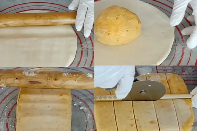 Lấy bột cán mỏng thành hình chữ nhật bề dày khoảng 2.5cm. Dùng thước đo cắt bột thành các miếng hình chữ nhật bằng nhau.
